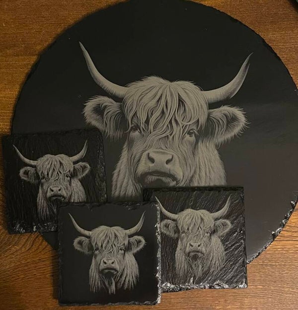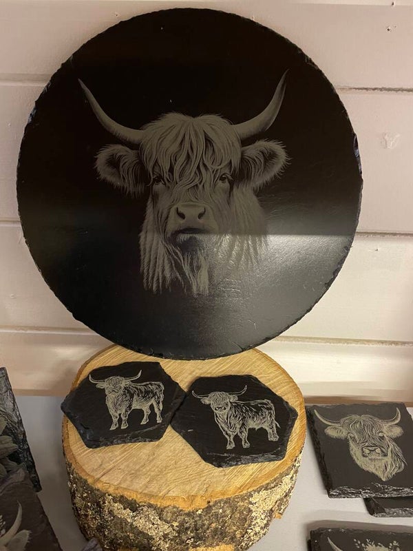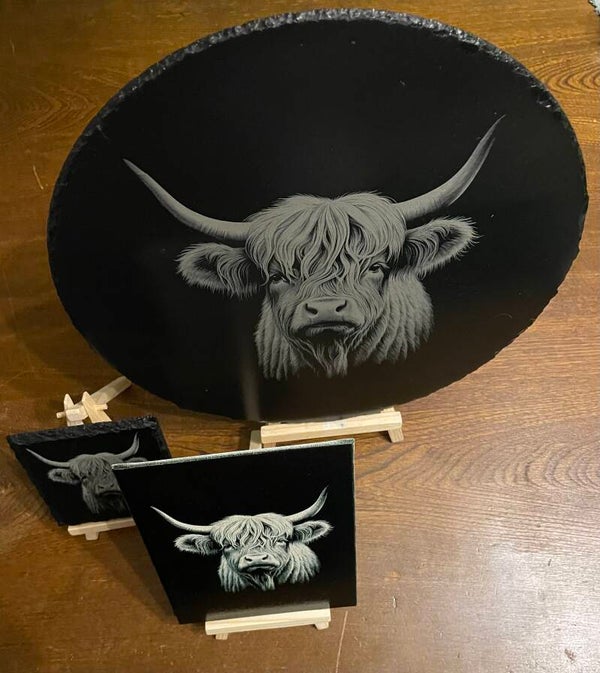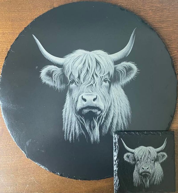 Natural slate serving platter depicting a beautiful, majestic Highland Cow from our family of Highland Cows range on slate.